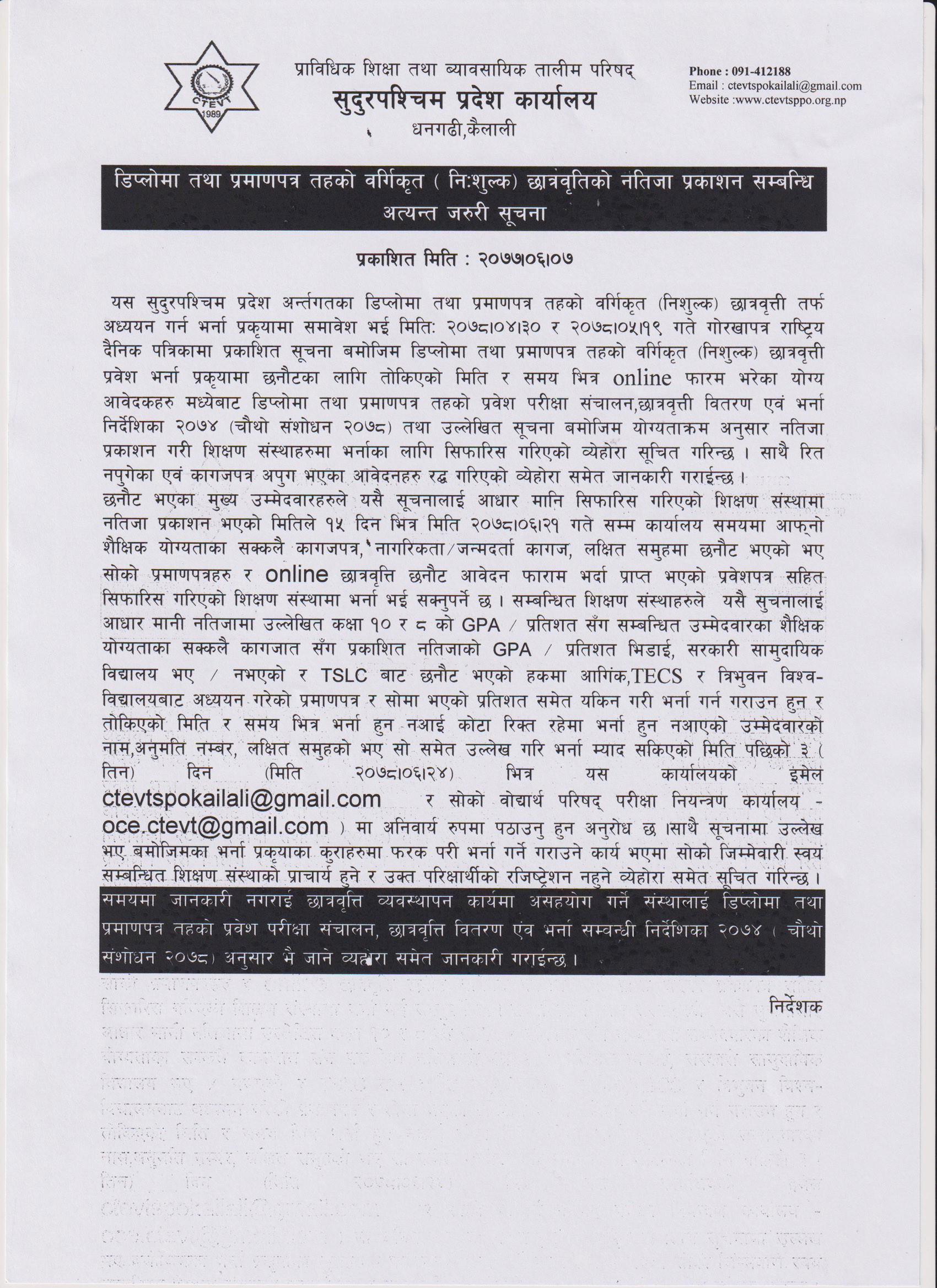 Result of Special Scholarship Program 1st, 2nd & 3rd Year (Engineering, Agriculture, Hotel, Food, Ent. Dev.) exam held on 2077 Mansir